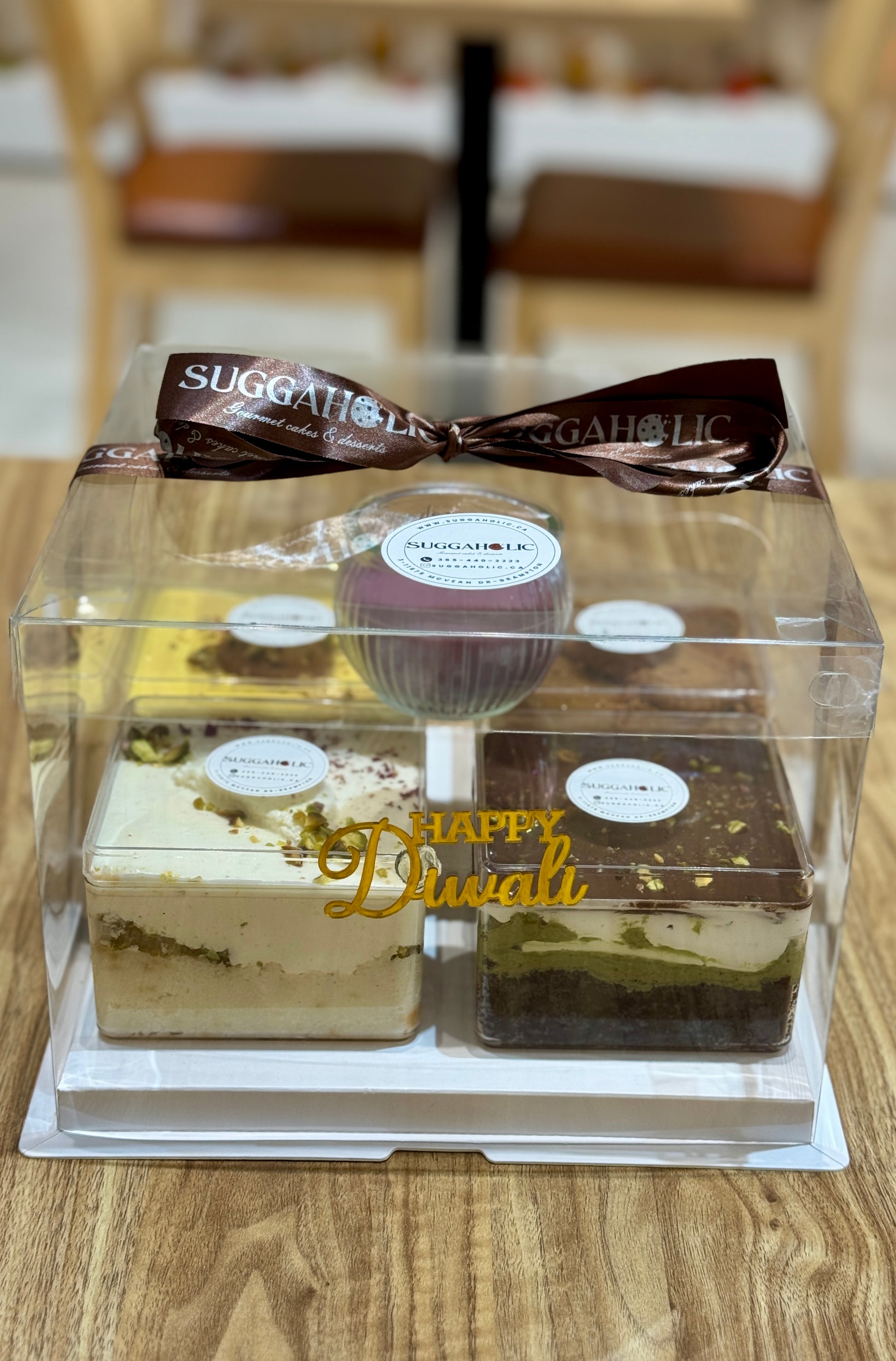 A delightful festive box including 4 signature fusion desserts and a scented candle — available in your choice of flavour: Gulab Jamun Fusion, Rasmalai Fusion, Motichoor Cheesecake, Biscoff Cheesecake, or Dubai Chocolate Pudding.